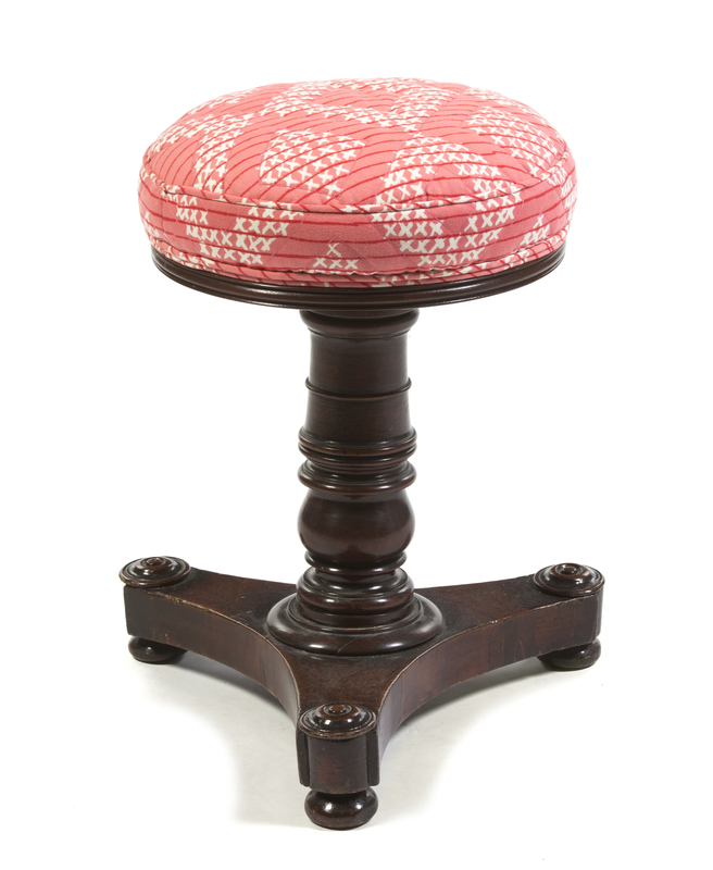 having a circular upholstered top on a ring turned standard, set on a tripartite base.