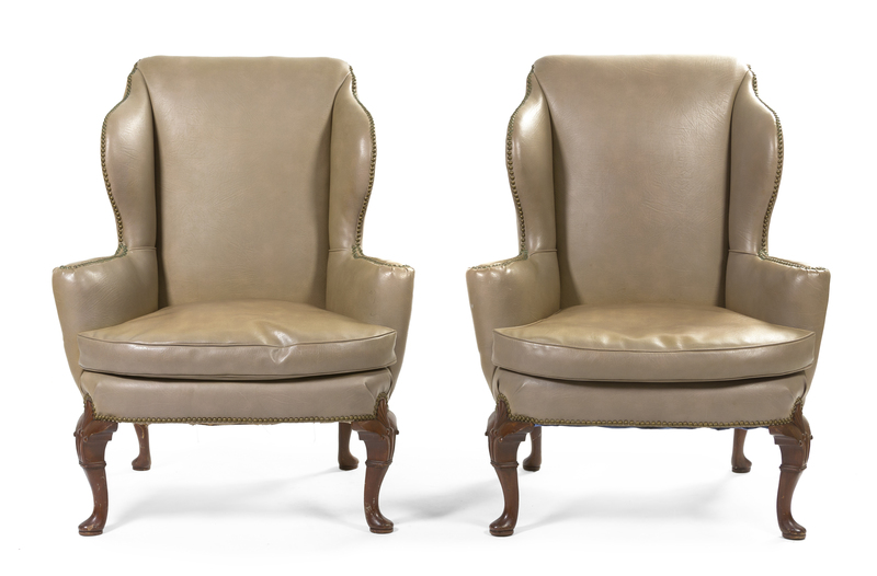 with leather upholstery and nail head trim, raised on carved cabriole legs.