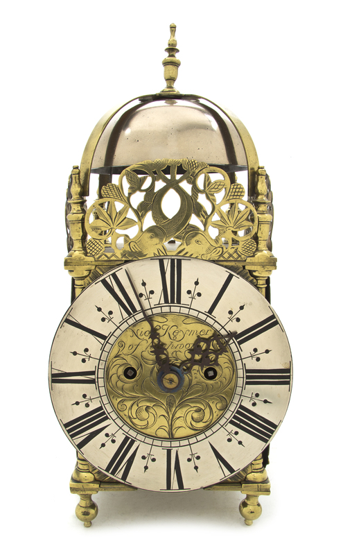 Highworth, having a domed top with finial over an open fretwork pediment with intertwined dolphins above the circular dial with Roman hours, the whole raised on toupie feet, having Fusee movement, spring driven with eight day duration chiming on the hour and half hour.