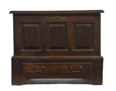 the hinged rectangular lid above the conforming paneled case, the base set with a single drawer, raised on bracket feet.