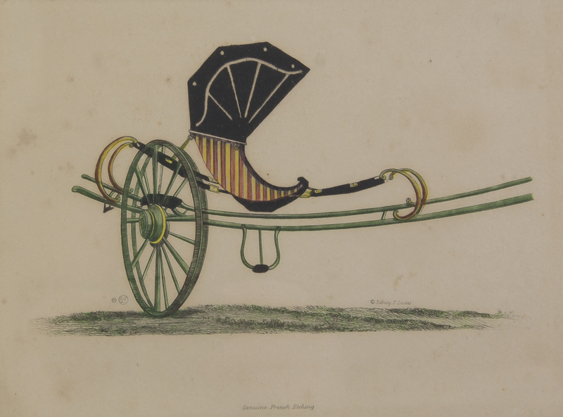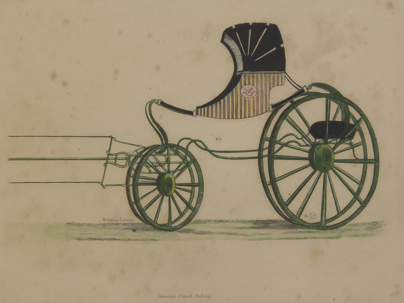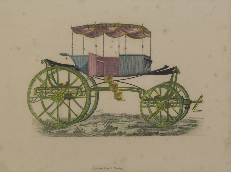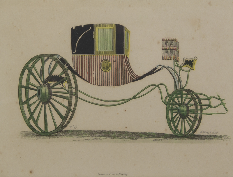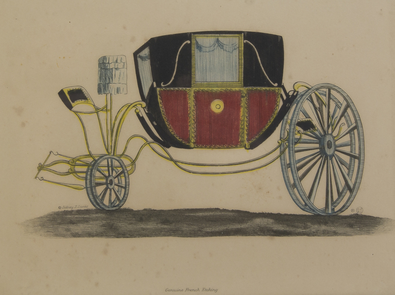 depicting various forms of horse drawn carriages, matted and framed uniformly.