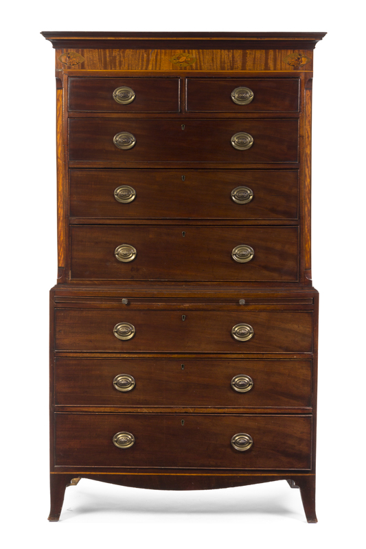 in two parts, the superstructure with a molded cornice above the inlaid frieze, over two short drawers and three graduated long drawers, the base with a dressing slide over three graduated long drawers, raised on splayed legs.