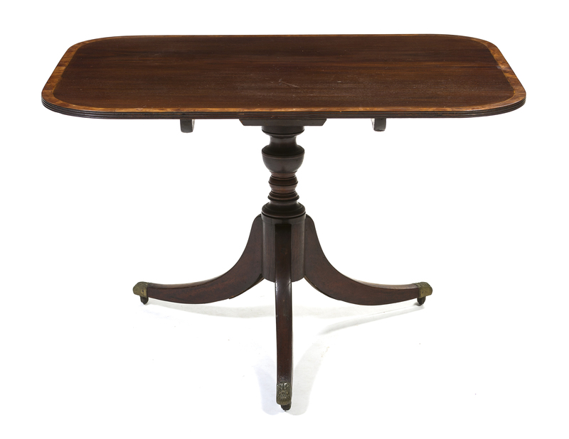 having a rectangular banded top with rounded corners, raised on a baluster form standard over three splayed legs, ending in brass caps and casters.