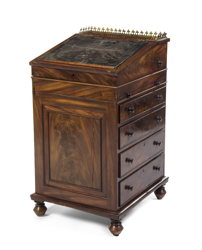 having a galleried rectangular top above the slant front, over four drawers raised on bun feet.