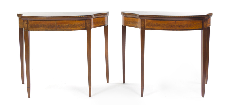 each with a serpentine flip-top opening to a plain playing surface over the banded frieze, raised on square tapering legs.