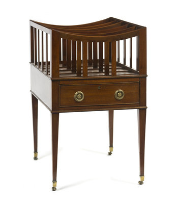 having five sections above the frieze set with a single drawer and a false drawer, raised on square tapering legs ending in brass caps and casters.