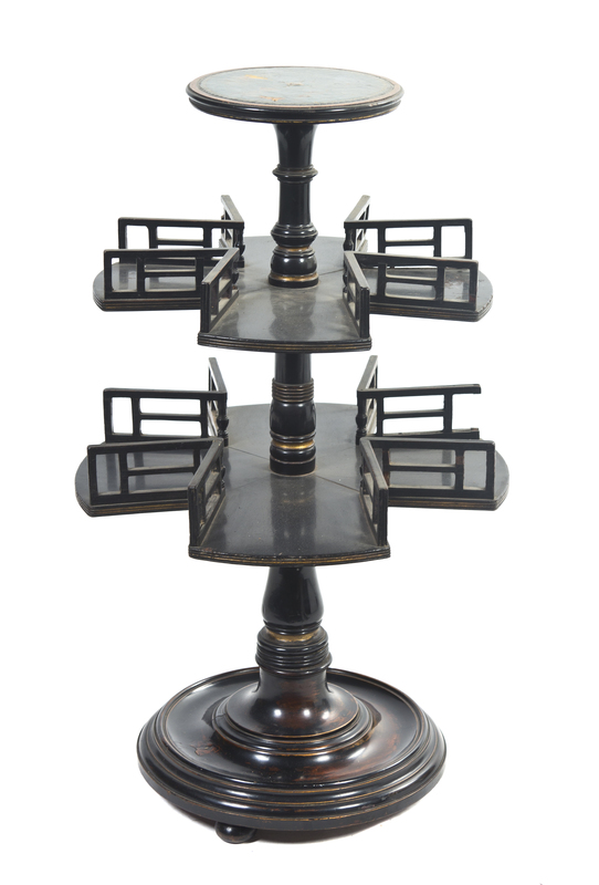 having a circular top over two revolving cruciform tiers joined by a turned standard, set on a dished base raised on bun feet.