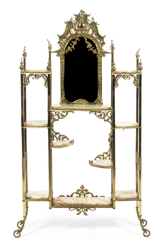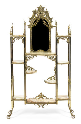 having a Rococo shell and foliate crest over the vertical beveled mirror, above a series of ten onyx inset shelves of various forms and sizes.