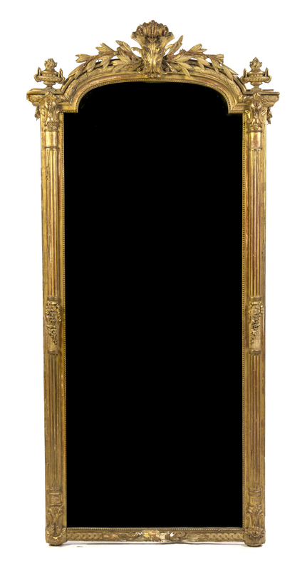 with a scrolling foliate crest flanked by flaming urn finials over a vertical beveled plate.