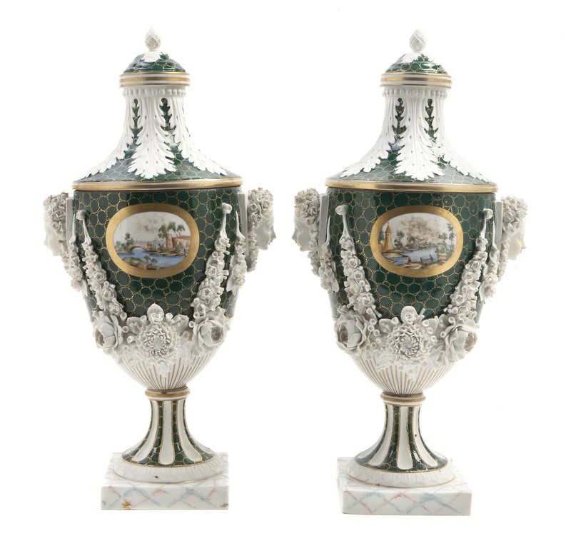 A Pair of English Porcelain Covered Urns, retailed by Ovington Brothers,