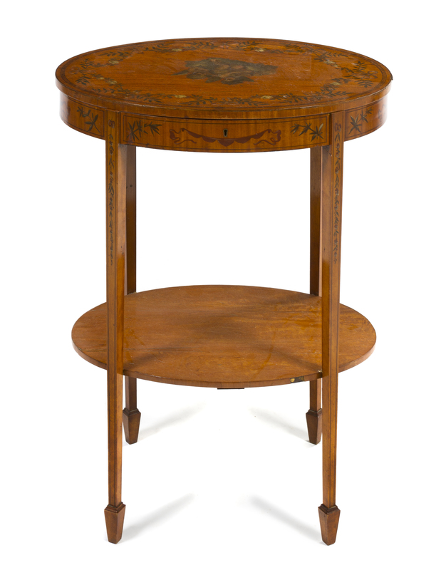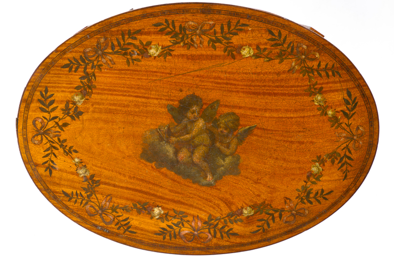 having an oval hinged top painted with two putti within a border of ribbon-tied floral garlands, opening to a void interior, raised on square tapering legs joined by a medial shelf ending in spade feet.
