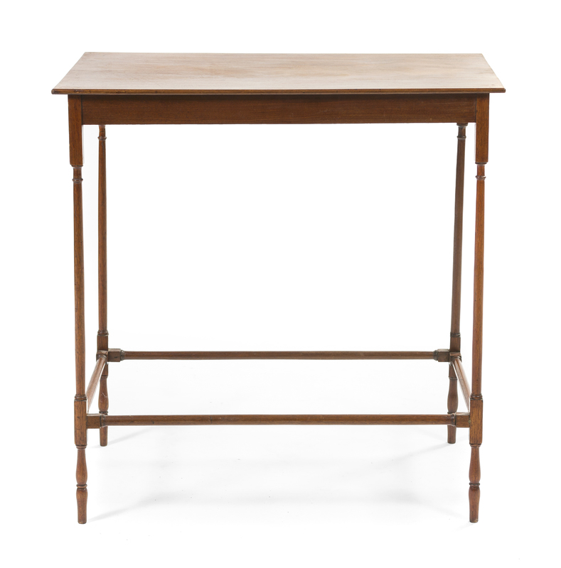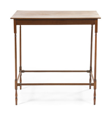 having a rectangular top over the plain frieze, raised on turned legs joined by conforming stretchers.