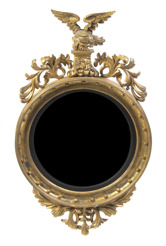 surmounted by a figure of an eagle and two carved foliate crests over the convex plate set in a conforming frame with repeating spherical finials.