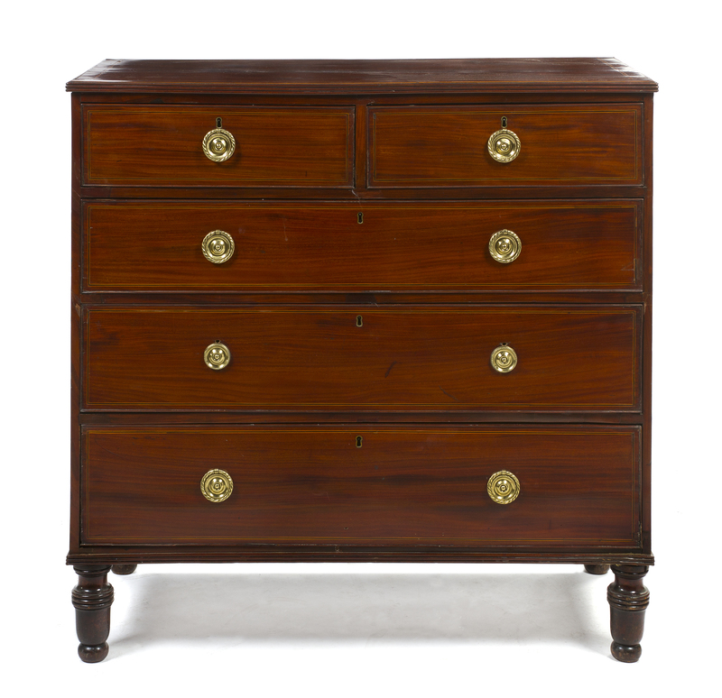 having a rectangular top over two short drawers over three long drawers, each with banded inlay, raised on turned legs.