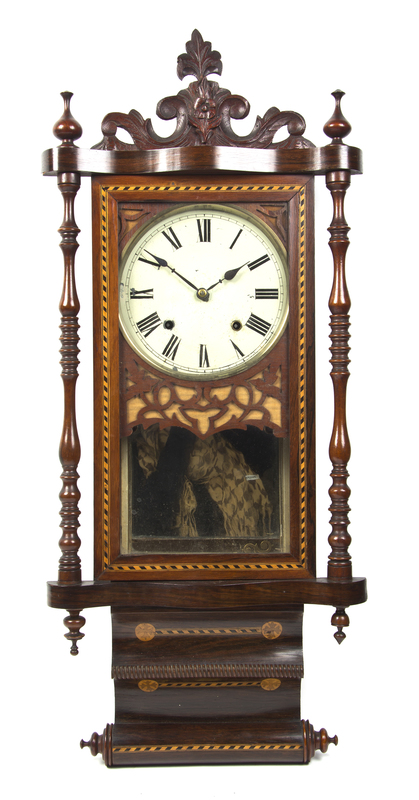 having a pierce carved foliate crest over the circular dial with Roman numerals within a fret carved border, further surrounded by inlaid banding, the whole flanked by turned columns, having time and strike movement.