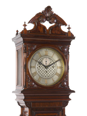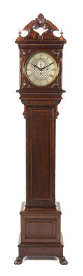 having a pierce carved foliate and rosette crest flanked by urn form finials over the silvered case with Roman numerals, further inset with a second dial having Arabic numerals, set in a straight trunk with carved scrolling ears over the plinth base, raised on carved paw feet.