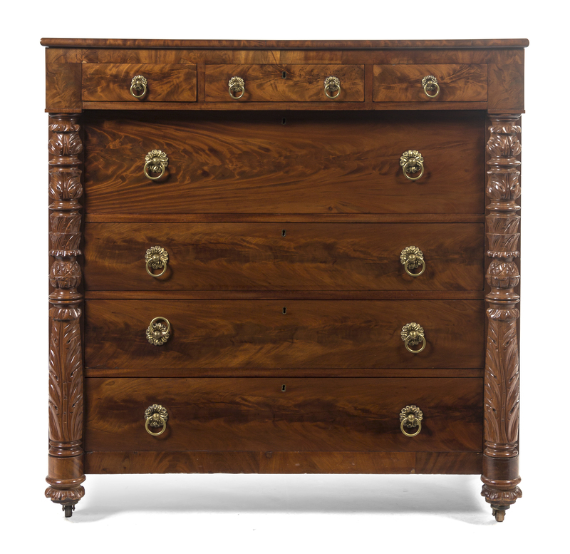 having a rectangular top over three short drawers above four long drawers, flanked by carved columns, raised on casters.
