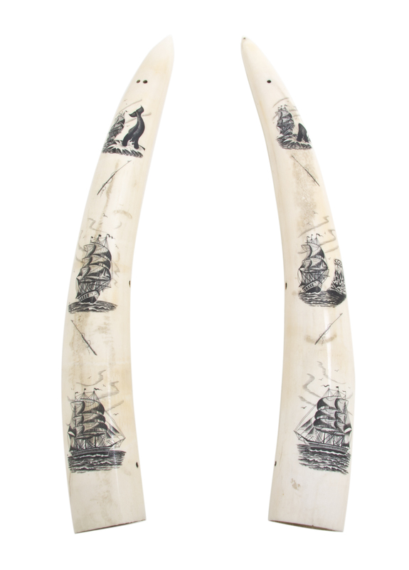 A Pair of Contemporary Scrimshaw Walrus Tusks,