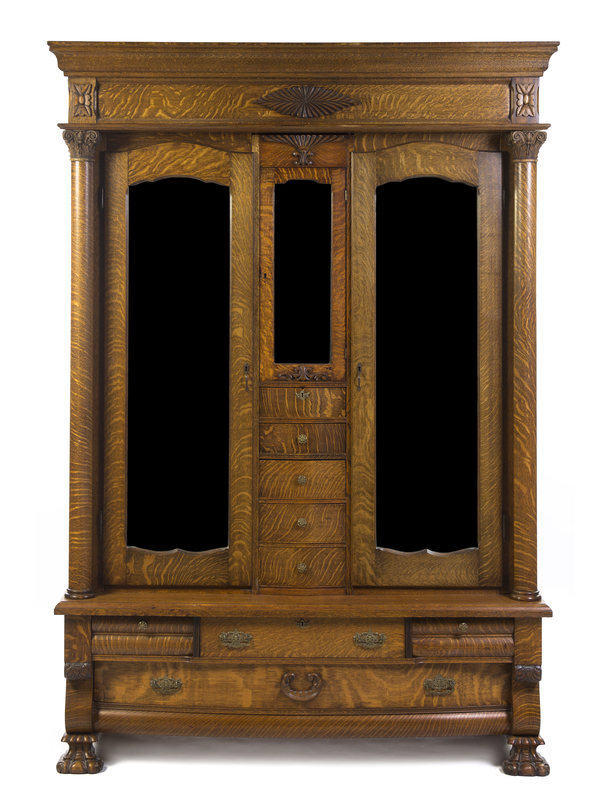 having a shell carved crest over three beveled mirror inset doors and five drawers, flanked by columns, all over an additional four drawers, raised on paw feet.