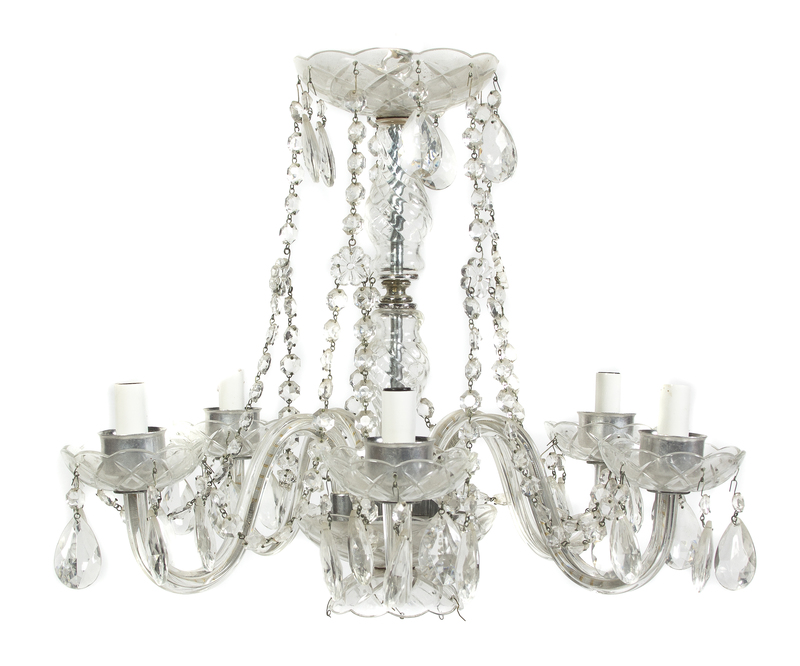 having a baluster form standard issuing scrolling candle arms, hung with prisms and swags throughout.