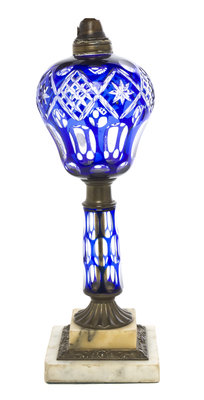 second half 19th century, having a stepped marble base with gilt-metal mounts supporting the blue cut-to-clear column with oval windows holding the conforming font, further having star cut decoration.