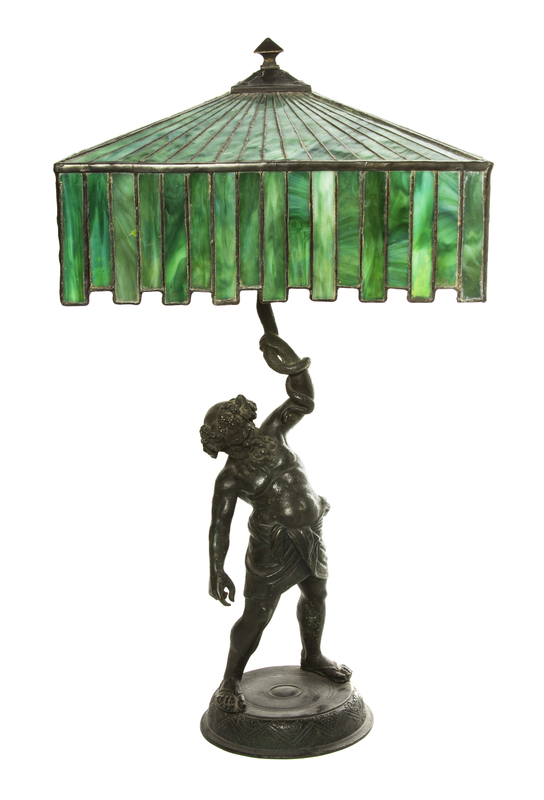having a tapering square shade with repeating geometric decoration over the conforming frieze, raised on a patinated metal base depicting the standing Silenus battling a serpent.