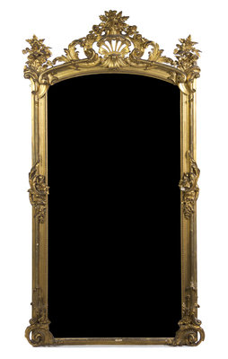 the crest having a basket issuing flowers over pierce carved shell and foliate decoration and a slightly arched frame, set with a conforming plate.