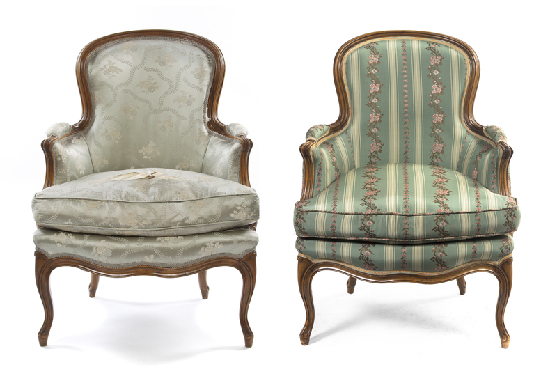 each having an arched crest rail over the upholstered back, arms and seat, raised on cabriole legs.