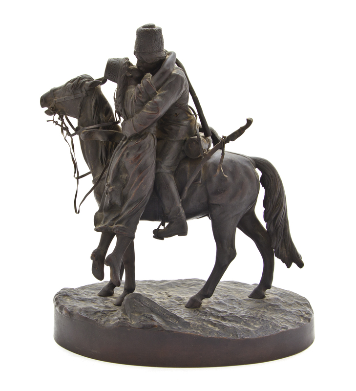 depicting a Cossack's farewell kiss, raised on an oval naturalistic base, signed in Cyrillic, further bearing a French foundry mark to underside depicting a maiden sculpting a vase.