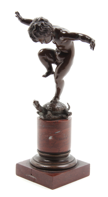 19th century, depicting a boy standing on a turtle, mounted on a rouge marble base, initialed indistinctly to bronze.