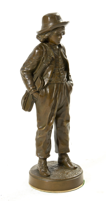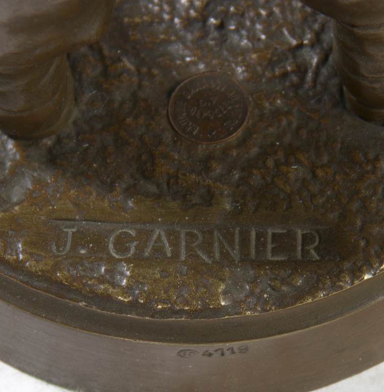 depicting a standing male youth holding a violin, raised on a naturalistic circular base, signed J. Garnier with seal reading Bronze Garanti au Titre L. V. Deposee and further numbered 4719.