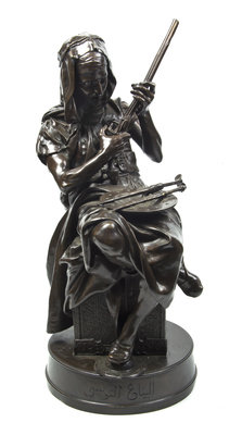 Le Marchand Tunisien, depicting a seated man cleaning his flint lock having a charger and two daggers in his lap, bearing an Arabic inscription to the circular base.