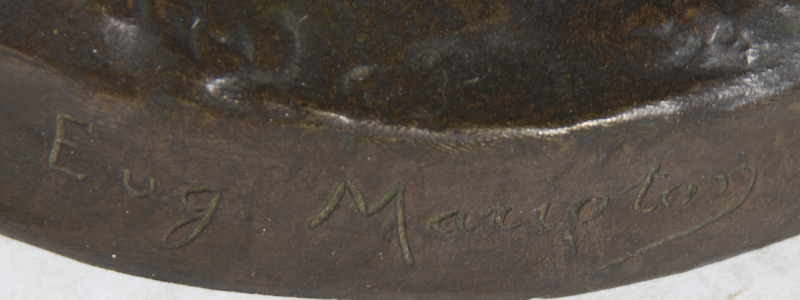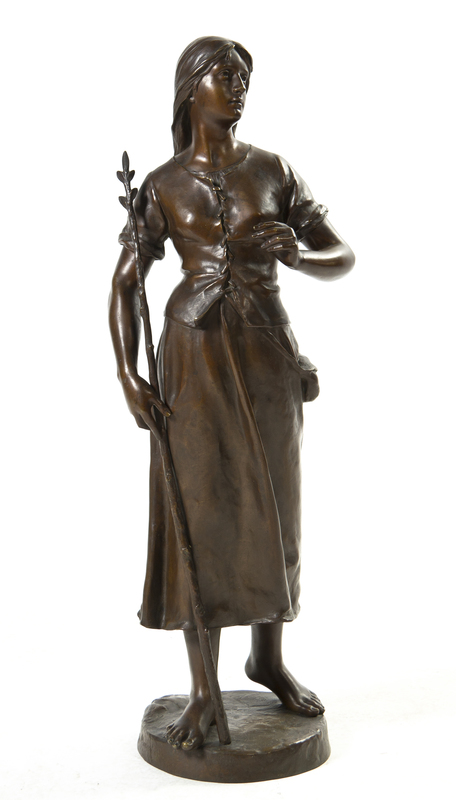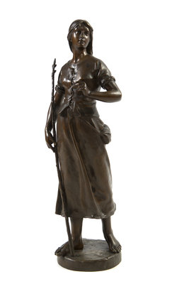 depicting a standing peasant woman holding a branch, raised on a circular naturalistic base, signed Eug. Marioton.