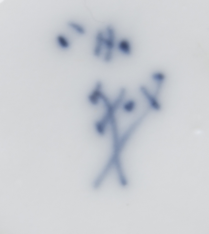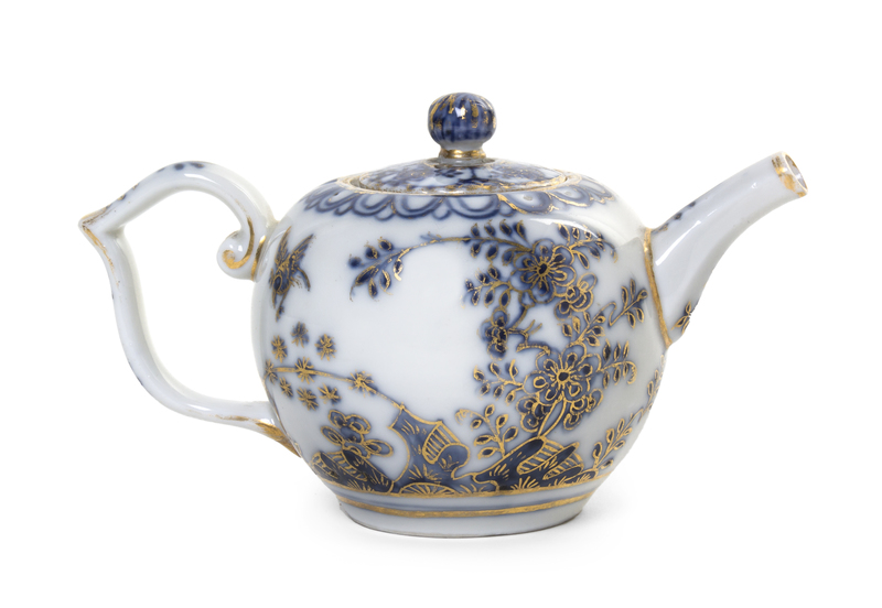 18th century, having Chinoiserie decoration of birds within a landscape, with gilt highlights, having dotted crossed swords in underglaze blue.