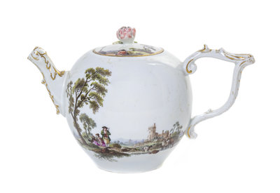 18th century, the lid with a floral finial and decorated with a figure in a landscape, the body with conforming decoration and gilt highlights to the spout and handle, having crossed swords in underglaze blue.