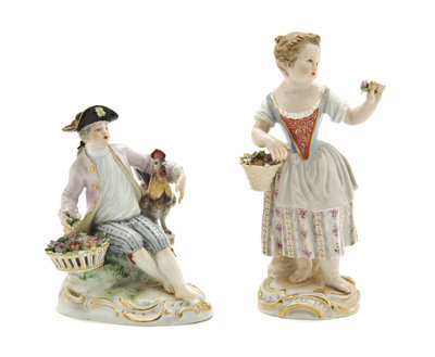 the first depicting a seated boy with a rooster and a basket of flowers, the second a standing girl with a flower in one hand and a basket of flowers in the other, each having crossed swords in underglaze blue and various incised marks.