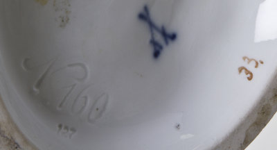 representing the arts, modeled as a female painter, a putto sculptor seated by her feet, having crossed swords in underglaze blue, further incised n160 and impressed 127.