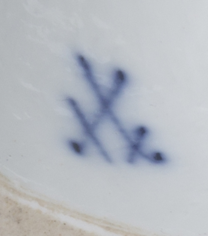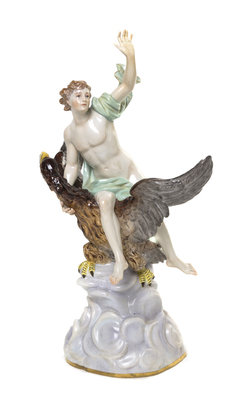 Ganymede and Jupiter, depicting the draped Ganymede astride Jupiter disguised as an eagle, raised on a cloud form base, having crossed swords in underglaze blue, further incised 530 and impressed 86.
