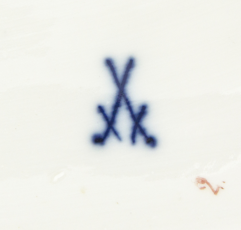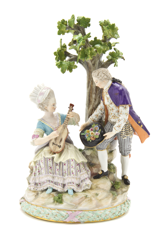 depicting a gentleman with a hat of flowers and a woman playing a lute under a tree, having crossed swords in underglaze blue, further impressed 72 and incised D75.