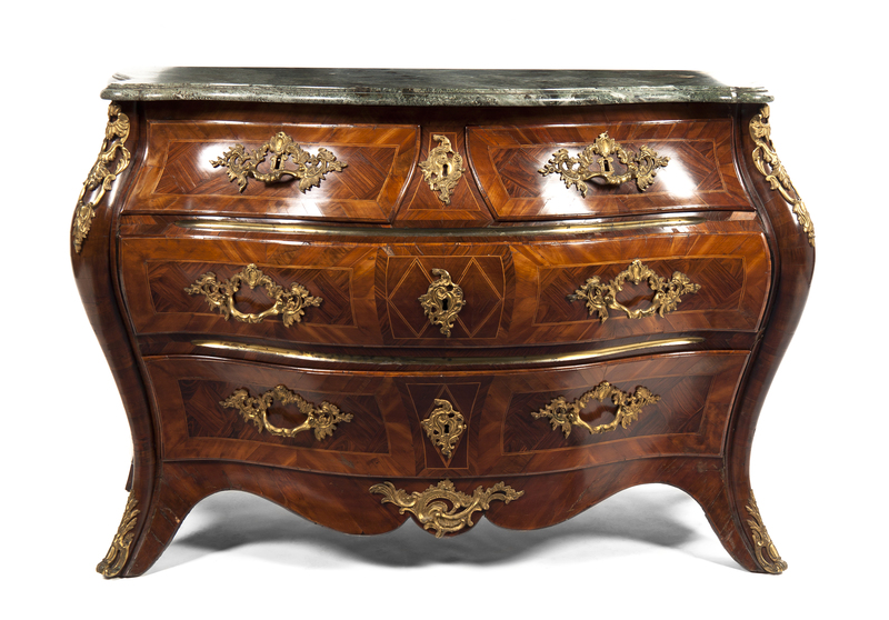 having a serpentine marble top over the conforming bombe case, fitted with three drawers, raised on slightly splayed legs ending in sabots.