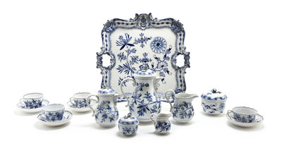 in the Blue Onion pattern, comprising a teapot, two graduated creamer and covered sugar sets, a milk pitcher, a tray, four cups and four saucers, having various crossed swords in underglaze blue; 15 items total.