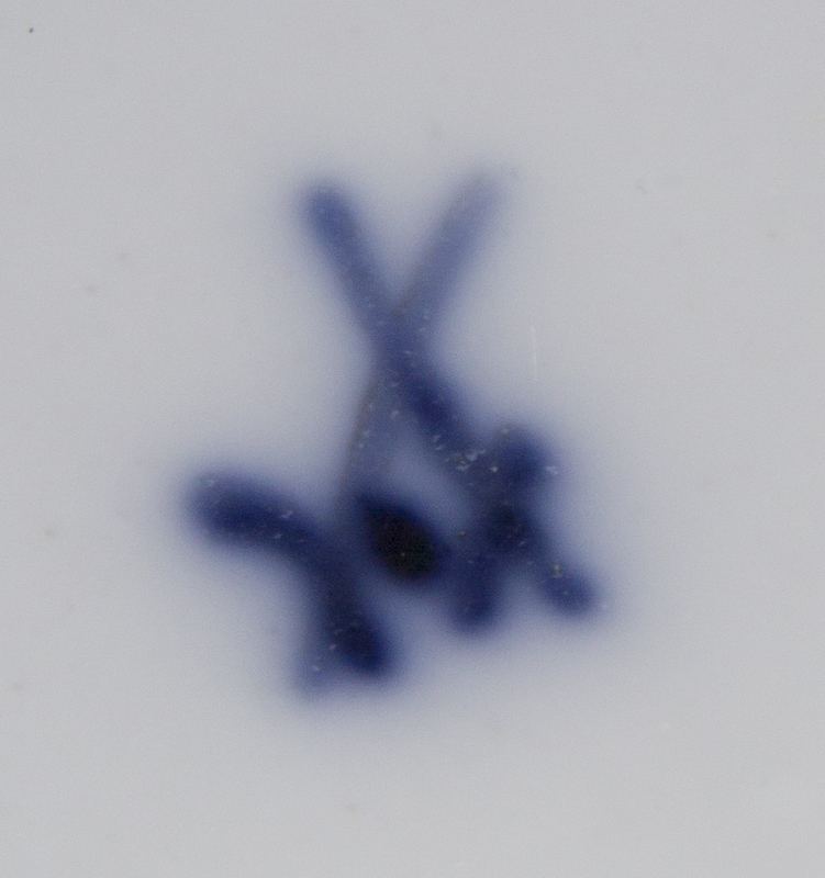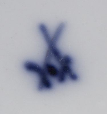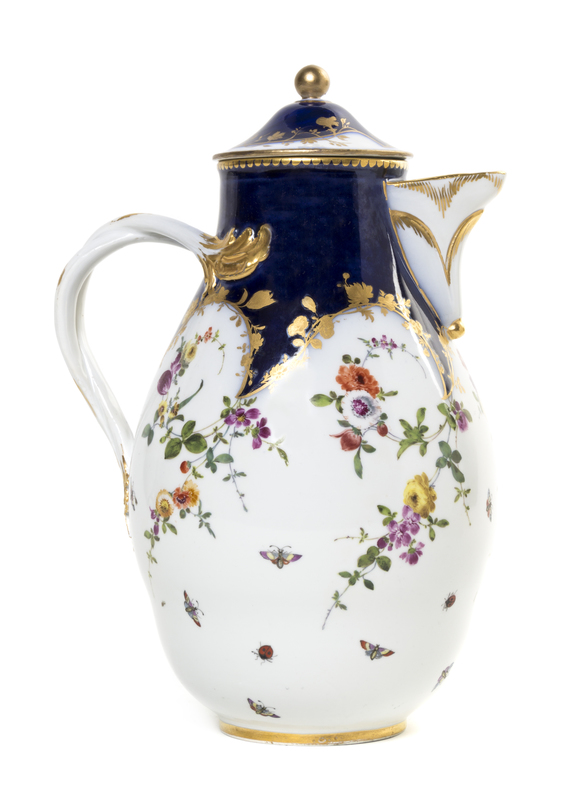 the ovoid body with applied intertwined handles, having polychrome floral and insect decoration, with a cobalt blue neck and gilt highlights, having dotted crossed swords in underglaze blue.