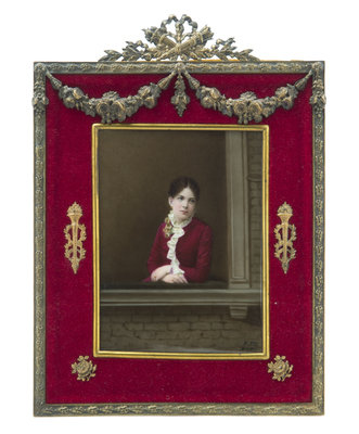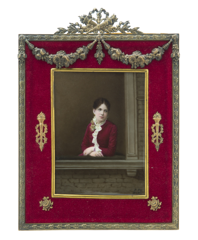 depicting a lady in 19th century attire looking out a window, signed indistinctly lower right, with impressed KPM scepter mark, set in a gilt metal mounted red velvet trimmed frame.