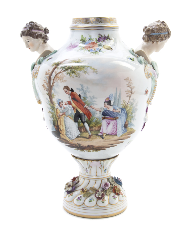 of baluster form with female mask handles, decorated with figures in a landscape, the verso with a floral spray.