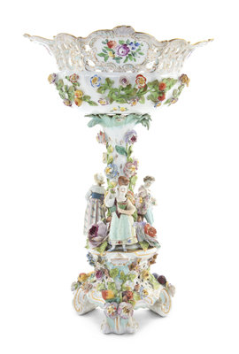 the scalloped reticulated bowl over the foliate encrusted standard set with three figures, raised on a tripartite base with conforming decoration.