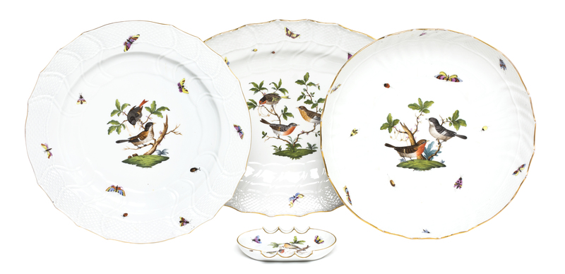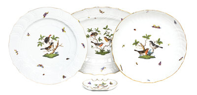 in the Rothschild Bird pattern, comprising a charger, a circular tray, an oval platter and an ash receiver.
