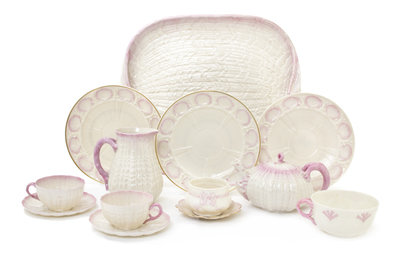first and second period black marks, comprising a teapot, a creamer, a sugar with underplate, two cups, two saucers, a mug, three plates and a tray.