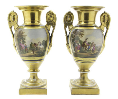 each of baluster handled form, decorated with figures in a landscape, raised on a square foot.