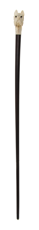 late 19th century, having a handle in the shape of a Scottie dog's head with glass inlaid eyes, with a Macassar ebony shaft, ending in a horn tip.