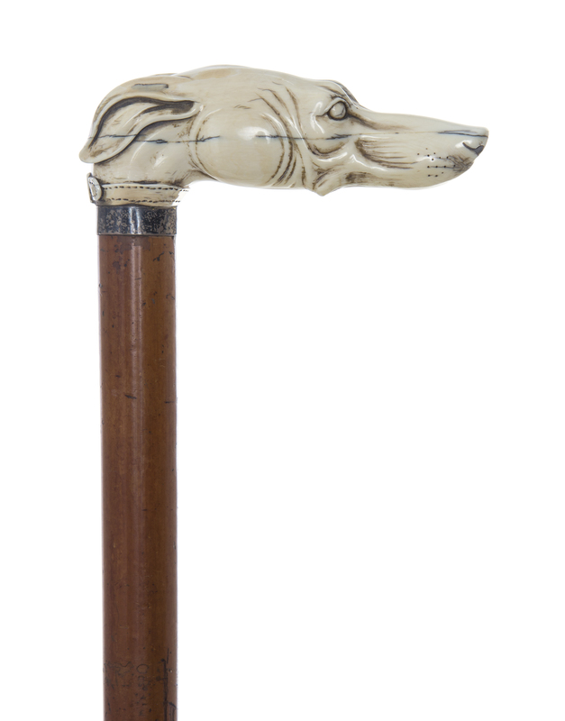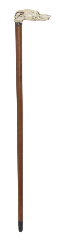 late 19th century, having an L shape handle in the shape of a dog's head, with a sterling collar on a malacca shaft, ending in a horn tip.
